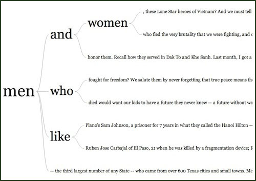 The word tree shows how Bush used the word "men" within the context of his speech. As the tree demonstrates, the word "women" is only used twice, and both times is used in conjunction with the word "men." Again, words that connote veteran sacrifice are tied to Bush's discussion of men's relationship to the war. There is still no mention of female veteran's service, which was voluntary during the Vietnam War.